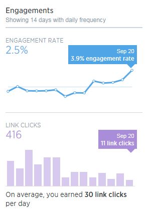 - Hashtags seemed to reduce the number of link clicks for the week! Here are the last two weeks worth of engagements and link clicks: