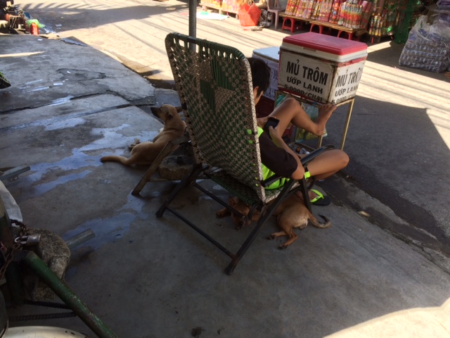 I was happy not to see any dogs for sale, anywhere. They are everywhere, though – every other shop has a small dog hanging out at the front. In general, dogs here look healthy, well taken care of and even loved. Here are a couple of dogs napping with their owner in the afternoon shade: