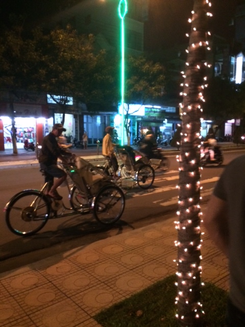 We did make it to Nha Trang, but I guess you’d probably already figured that part out. We also made it through an even crazier taxi ride from the airport to the hotel some 40 kilometers away. The driver practically flew through the torrential rain, hitting water puddles with a force of a speeding boat, spraying miserable motorbike drivers in our wake. His radio was sputtering incessantly, a woman’s voice chattering in high-pitched Vietnamese, accompanied by constant blowing of the car horn. Every driver, at all times is blowing the car horn – I’m not at all sure how it helps others, and it certainly pisses of bike riders, which sometimes shake an angry fist in protest. This time, they just hunched down under their plastic ponchos and persevered through the wet misery.