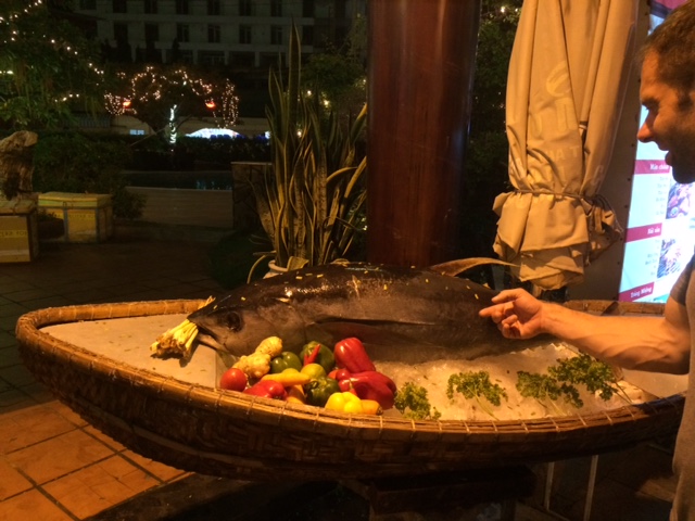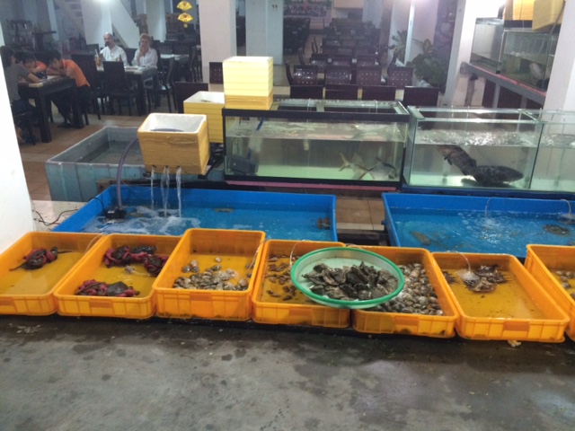 We literally ran away from the rickshaw drivers and things got better on the other side of the boulevard, where tourists were expected to walk by the local restaurants, most of them displaying live or recently deceased sea life out the front: