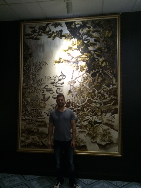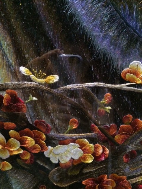 It was half-workspace, with girls embroidering right in front of us and half-art gallery. This is just one of the “paintings” on display – I’ve tried to capture the fine quality of fine embroidery – it looks three-dimentional.