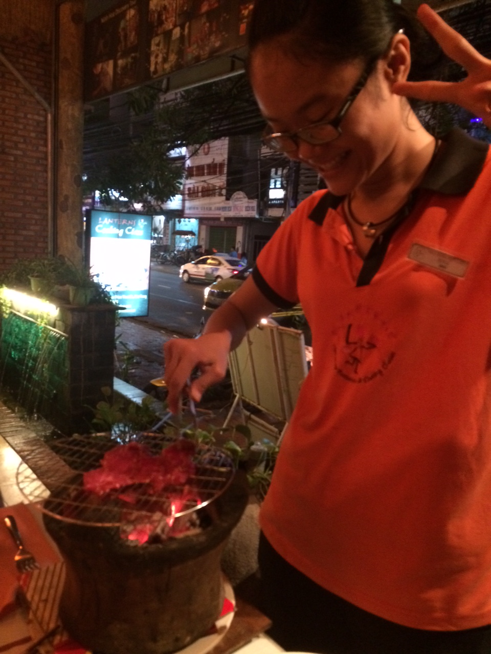 …as a personal chef cooked beef at our table in a mini-babrbecue pot filled with hot coals: