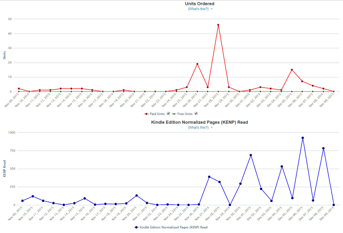 If you’d asked me what I thought about KU and KENP a month ago, I would have probably said “eh”. However, thanks to the recent promo blasts, the KENP graph (below) looks like the world’s awesomest mountain chain. In fact, I’ve made about $22 in the last couple of weeks just from people reading their “free” copies: