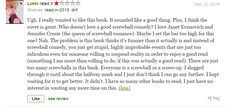 This one popped up on Goodreads – thank god it’s not on Amazon, which would potentially mean fewer sales…I’m feeling pretty philosophical about it – I guess you can’t expect everyone to love a book, any book, it’s a matter of personal preference. Wish I could make sense of it, though – the main complaint from someone who loves screwball comedy seems to be that it’s “improbable” and has “too many screwballs”. The most disappointing thing is actually that I can’t use this particular critique to improve my writing. Anywho, I’m off to enjoy life 🙂