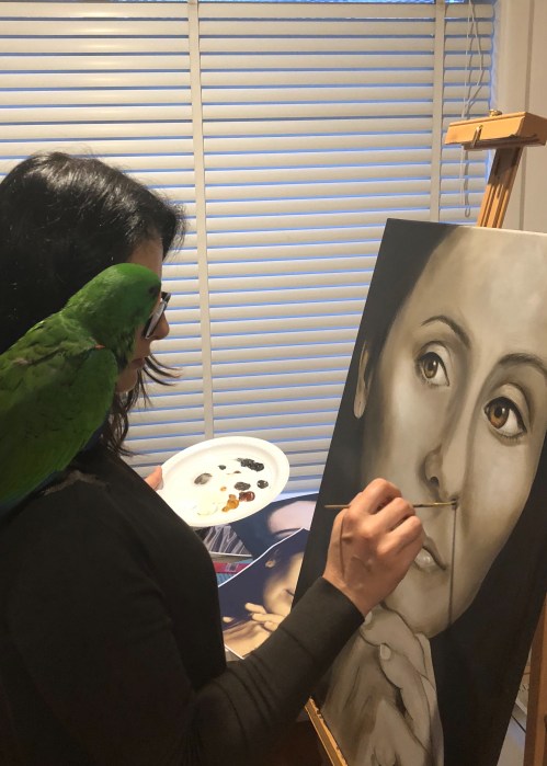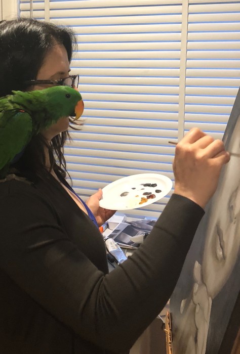 Ah, but back to the exciting news! One week in the sunshine, away from angry customers and meaningless bureaucracy, and I am back! Today was the last day of my leave and I managed to break the inertia by not only writing a whole new chapter but by painting as well. I don’t have a progress photo of the latest portrait, instead here is me working with my new friend, rescue Eclectus named Archie (I am using water soluble oils and only linseed oil as solvent, in case you’re worried about toxic fumes). He is actually interested in what I’m doing: